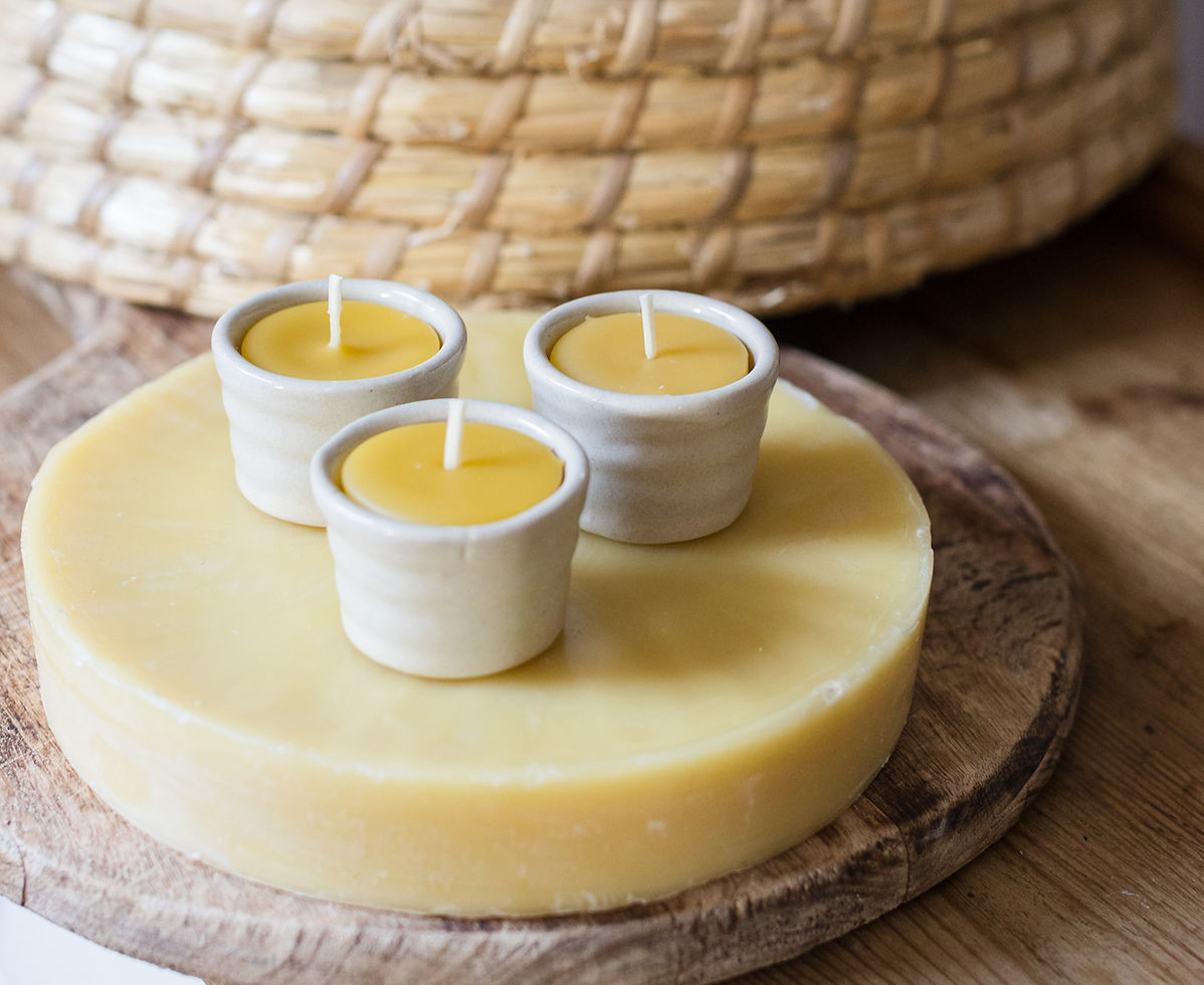 Our little golden candles begin as a whisper in a beehive—thousands of tiny bees working together for countless hours to create the golden fragrant wax that now glows in your hands.